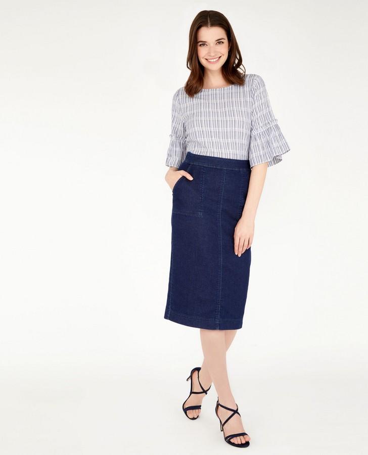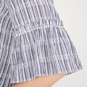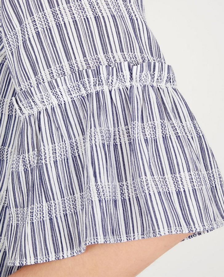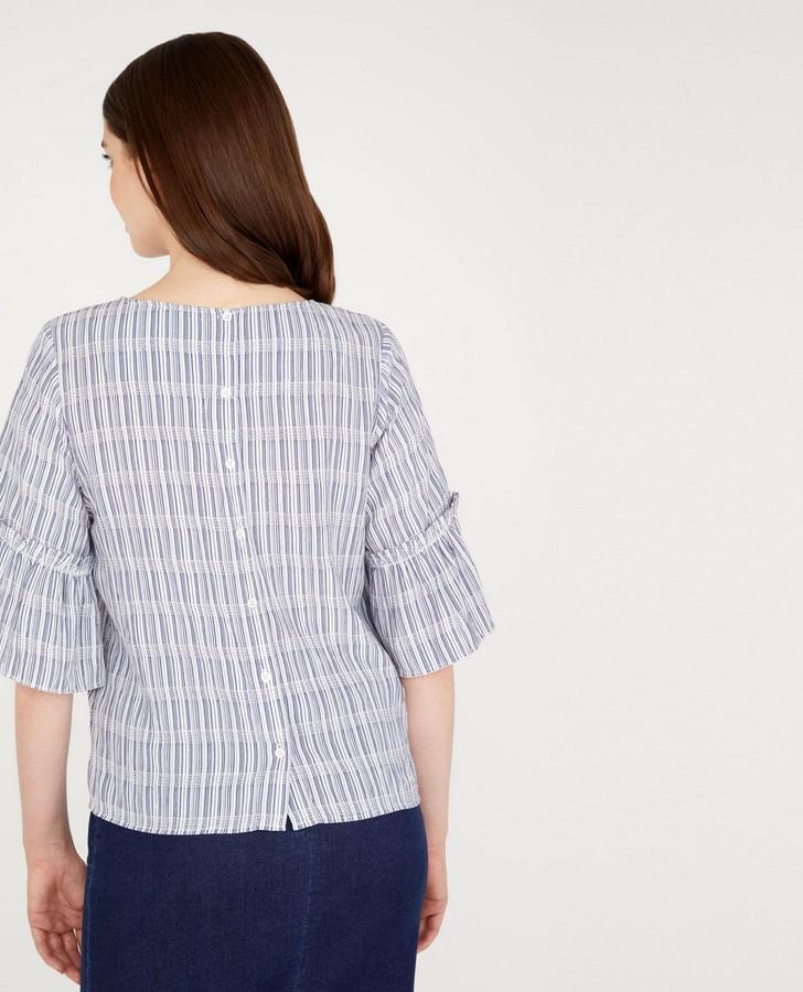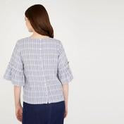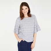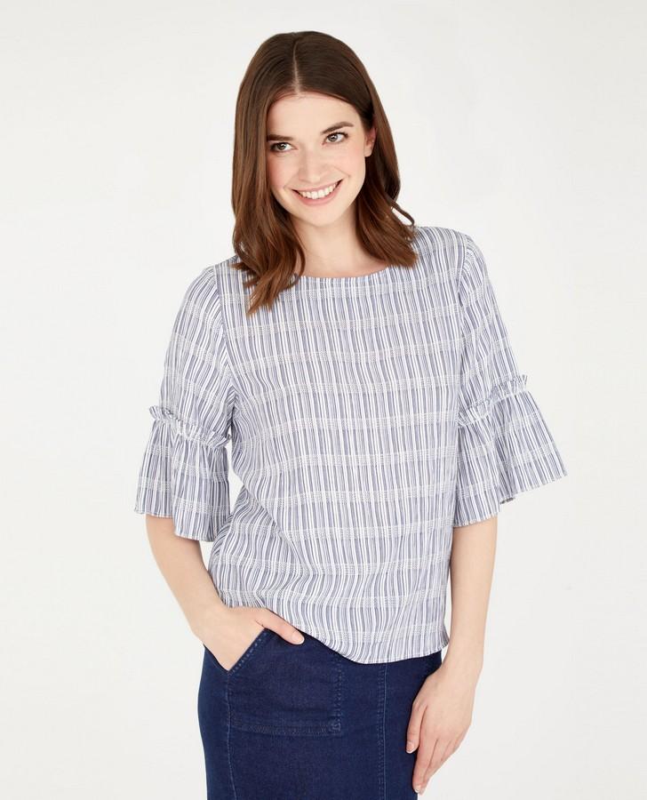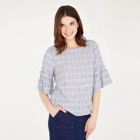 This piece is casual femininity that is effortlessly easy to wear. Featuring flared half sleeves with a ruffled trim, this top is perfect for staying cool in the lingering summertime heat.