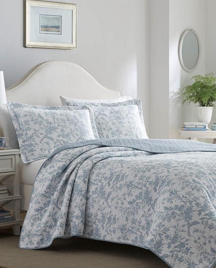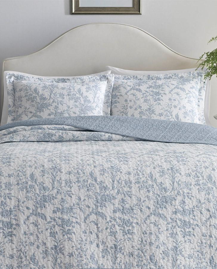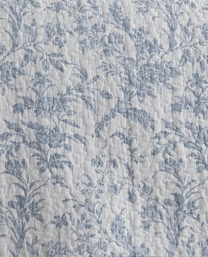 The Amberley Soft Blue quilt set offers a clean two-tone floral design. This delicately rendered floral toile is classic and fresh in blue on white and offers timeless elegance for your bedroom. Two quilted shams matching the quilt are included with the set (one with twin size). The quilt reverses to a mini print vine coordinate on a blue background that also trims the edges for a neatly tailored finish. Pre-washed for extra softness and comfort, this quilt set will create a relaxed and inviting update for your bedroom.