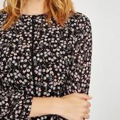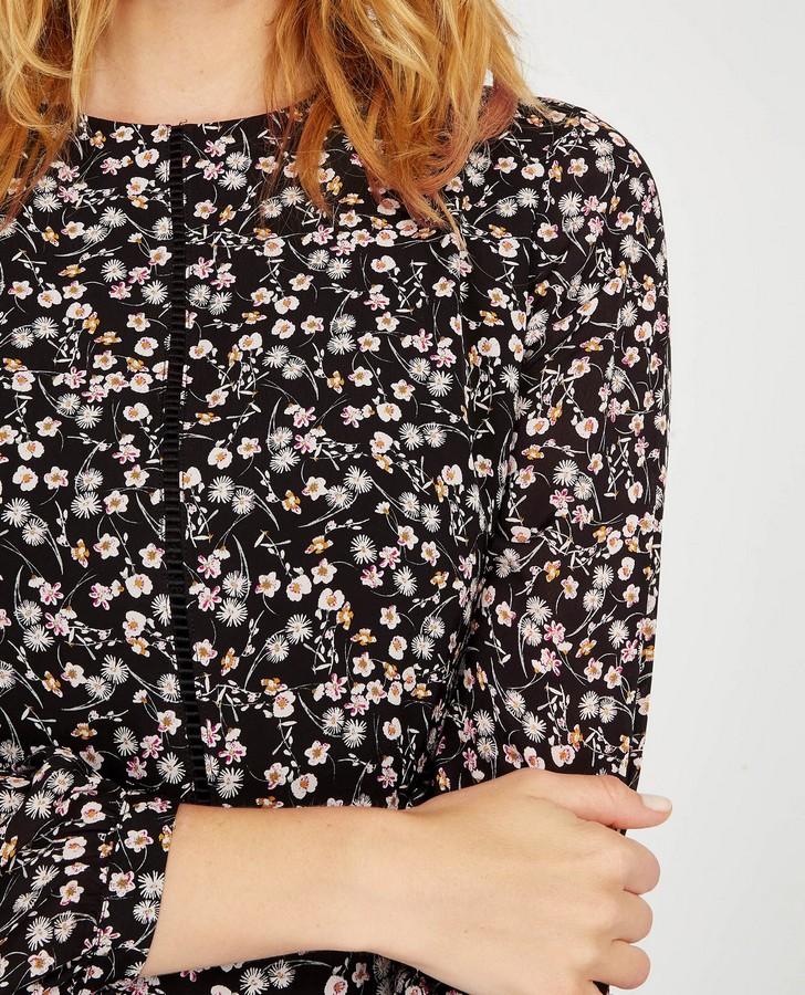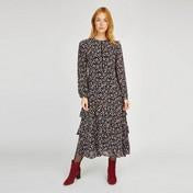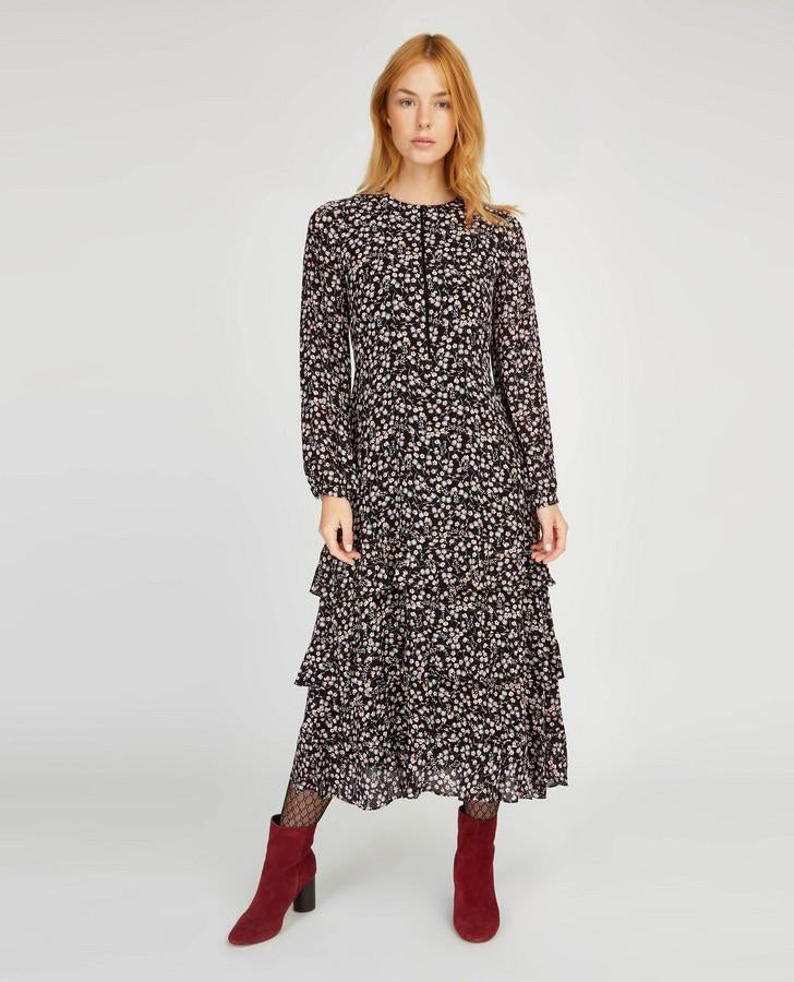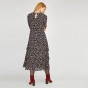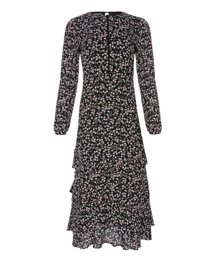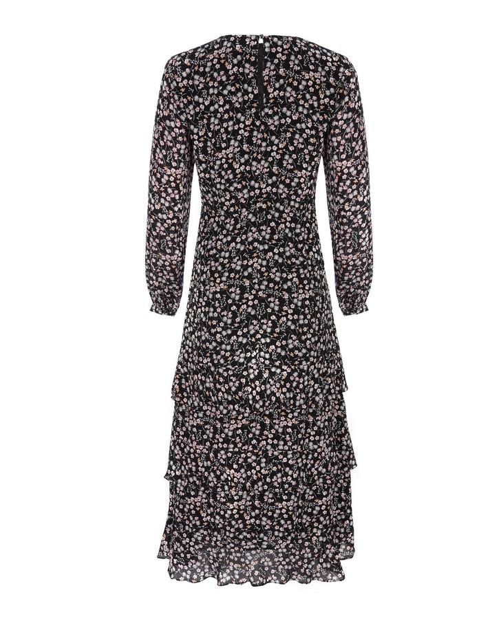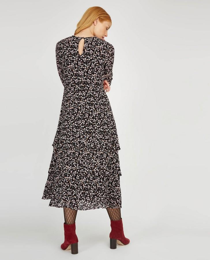 Classic black meets elegant tiers in this long-sleeved dress. Finished with the Swirling Ditsy print, this dress is simple grace and has a touch of fancywork down the front.