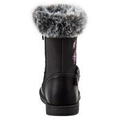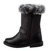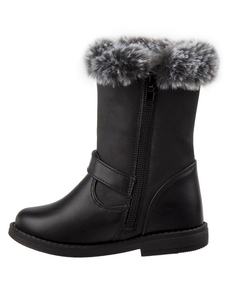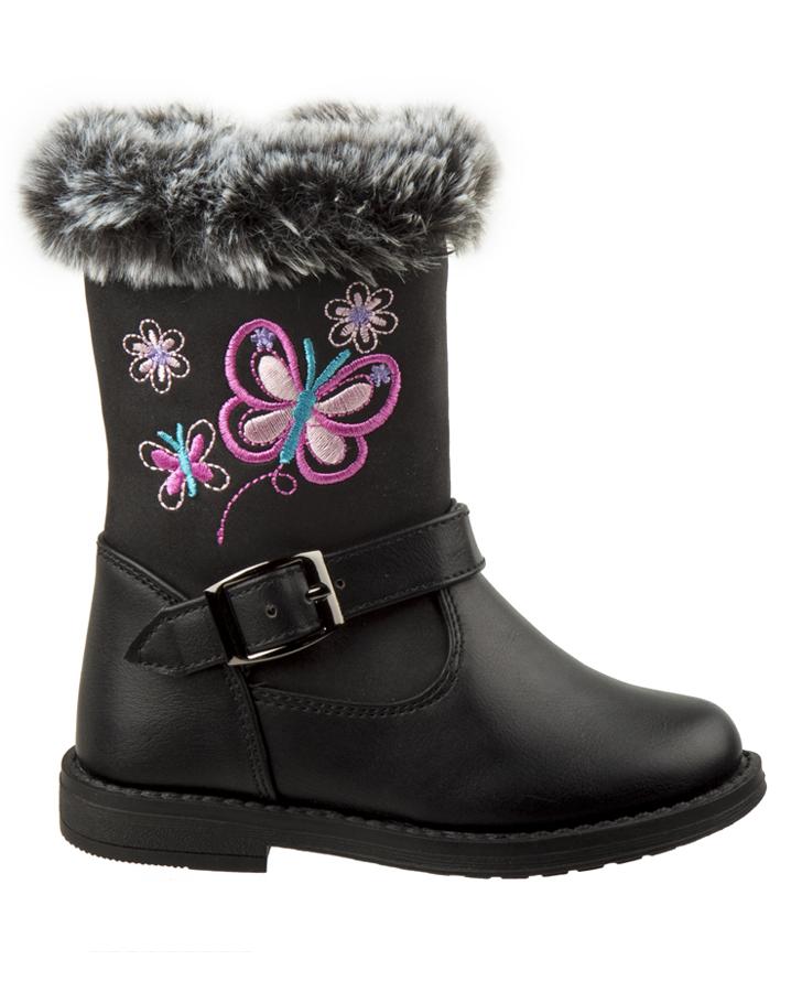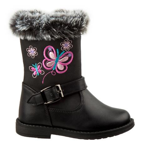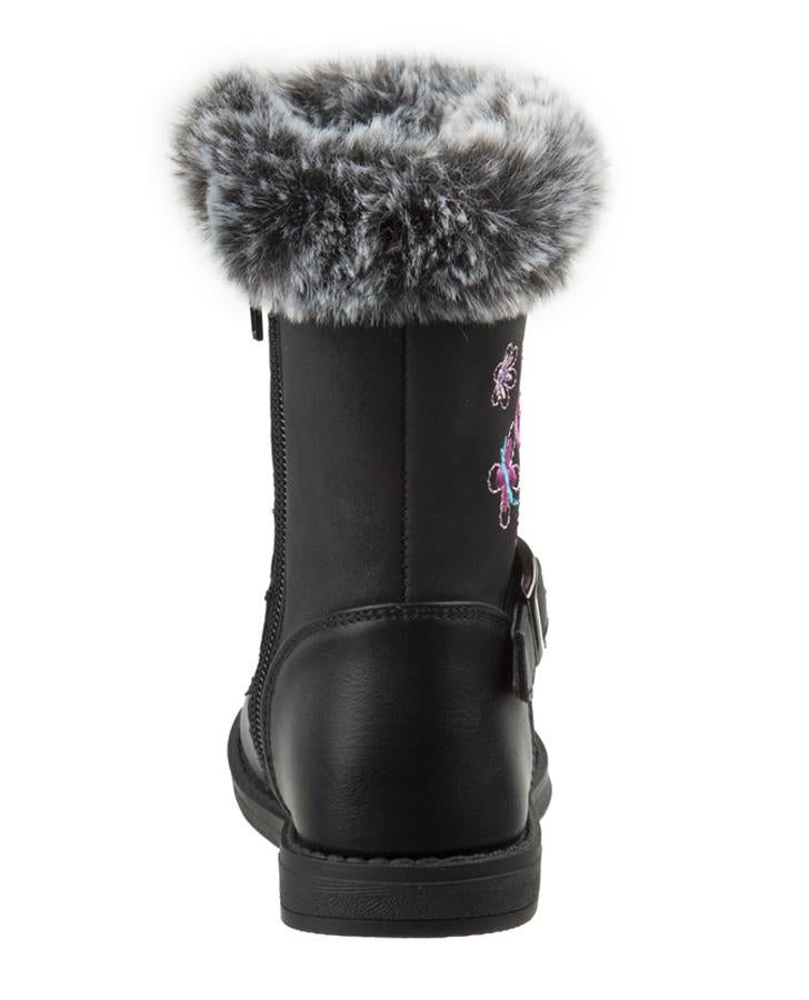 This boot features a warm yet fashionable fur trim with butterfly embroidery.