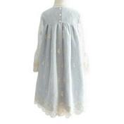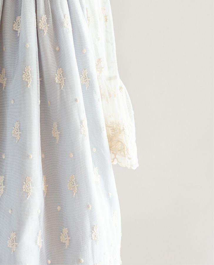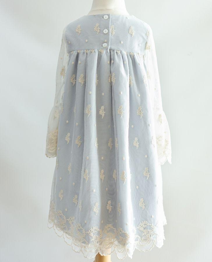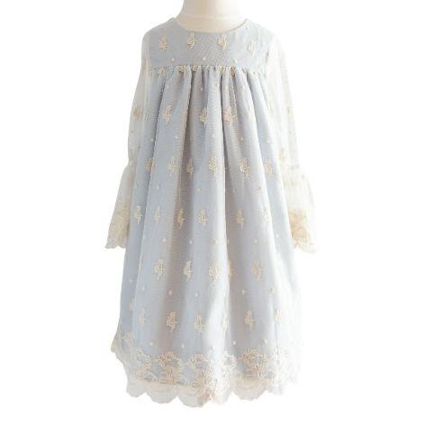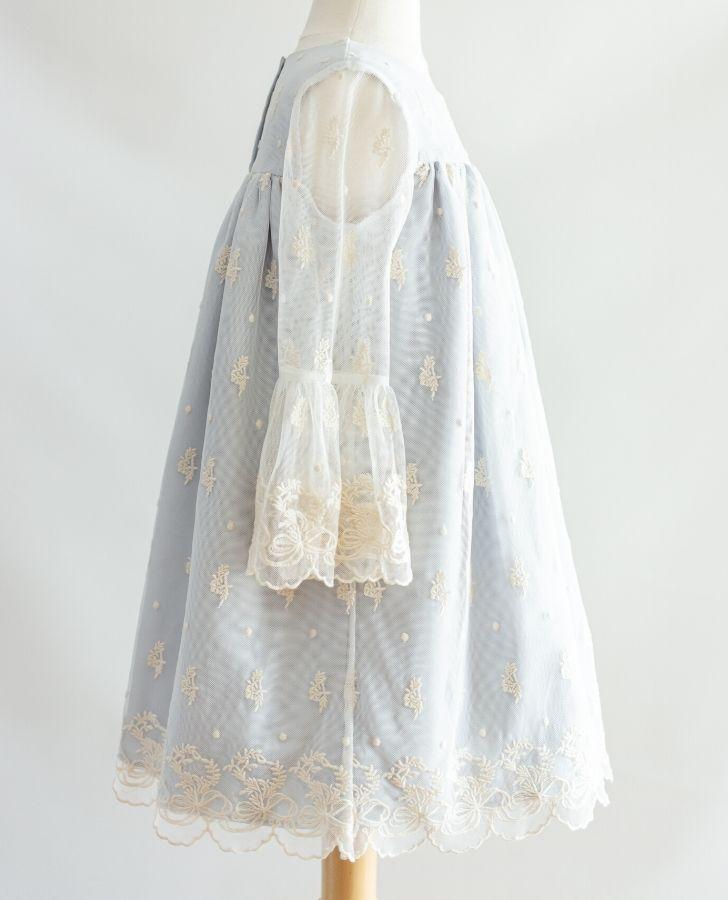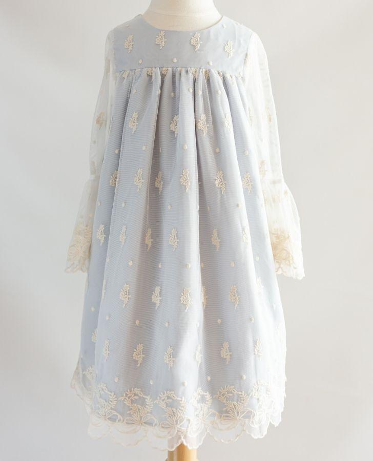 Girl's blue toddler dress with ivory embroidered mesh overlay and bell sleeves.