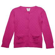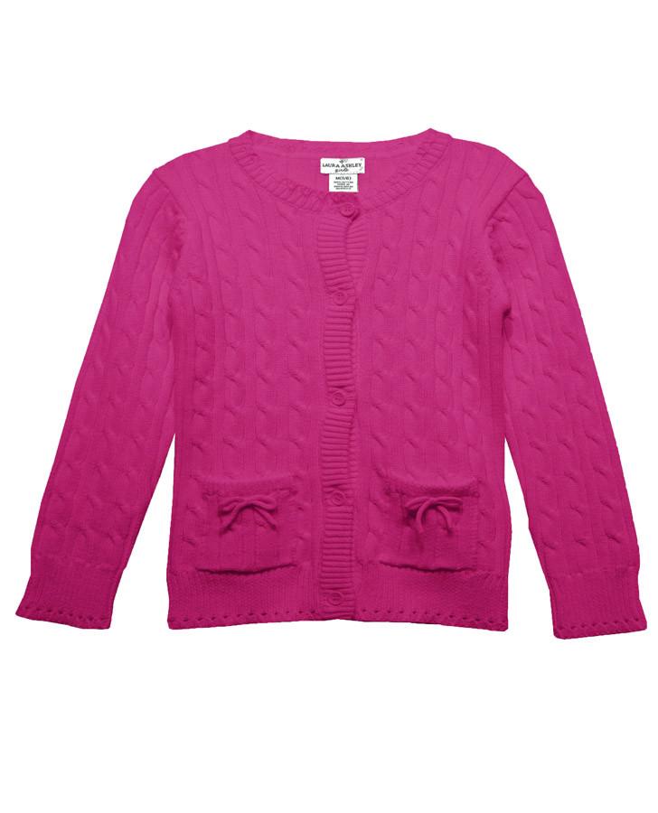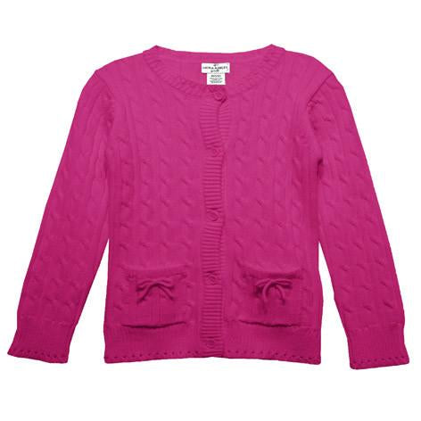 This cute cable knit cardigan offers style and comfort. The fuchsia cardigan is complete with two bow detail front pockets and button front closure. It's the perfect layer to keep warm.