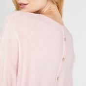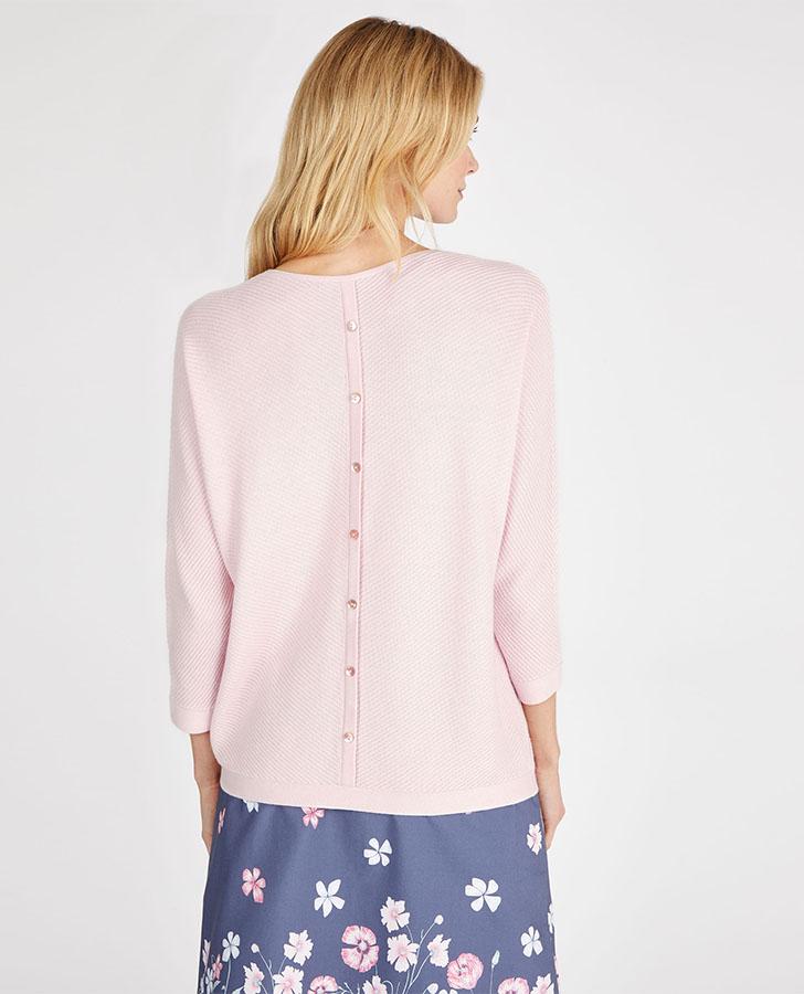 Beautiful ribbing detail and soft camellia pink make this sweater a feminine weekend favourite. Subtle textural changes at the neck and cuffs, plus button detailing down the back, give this piece a contemporary feel.