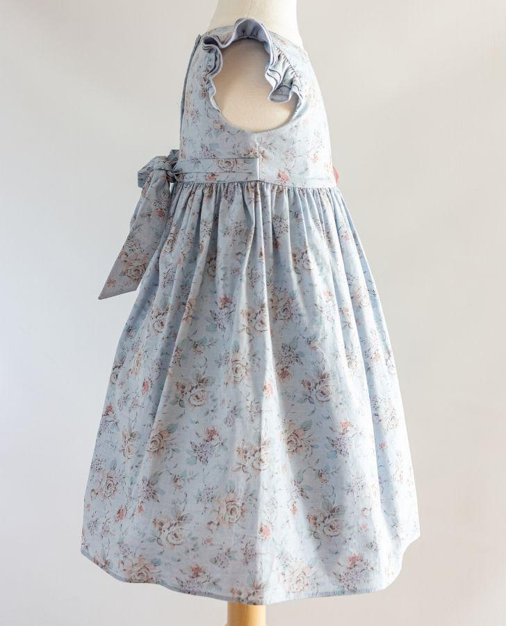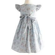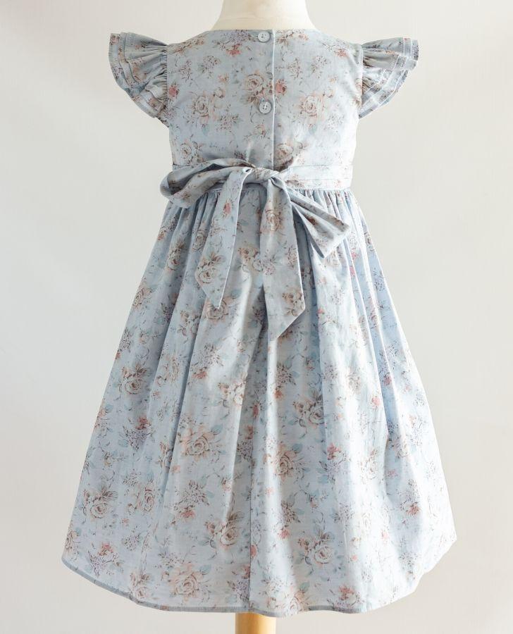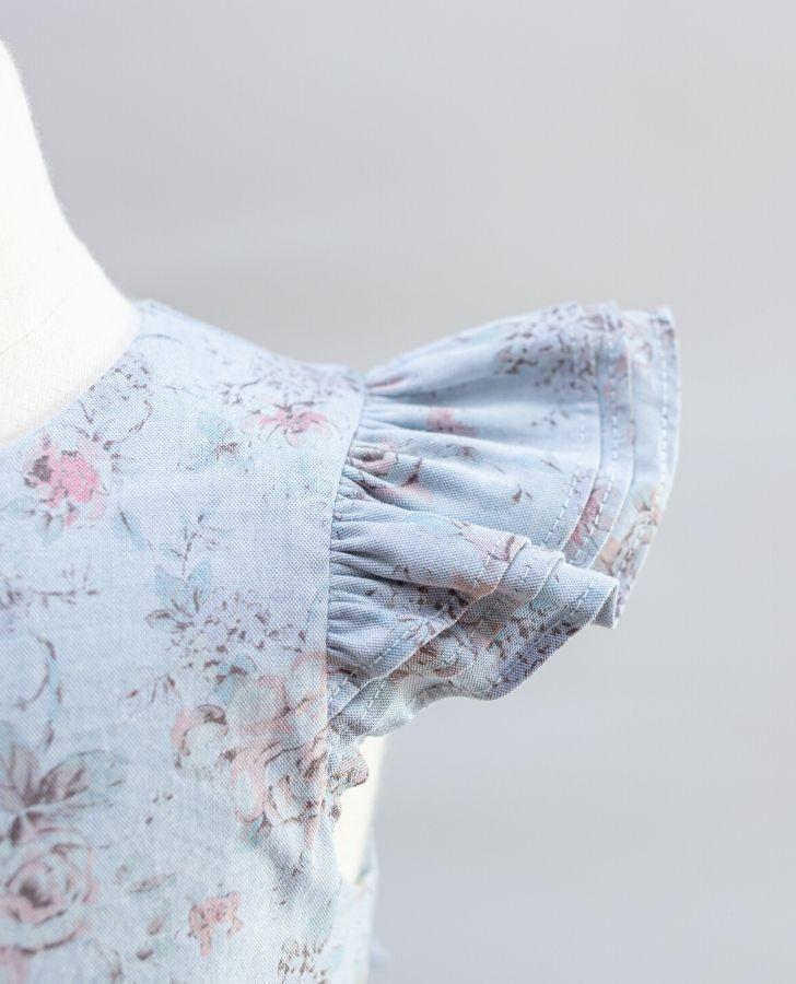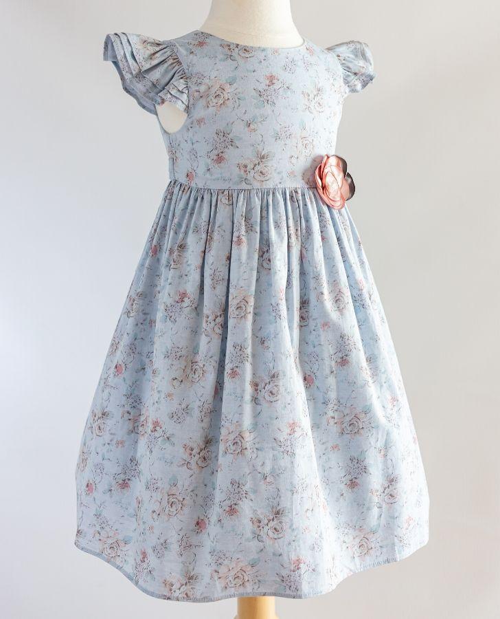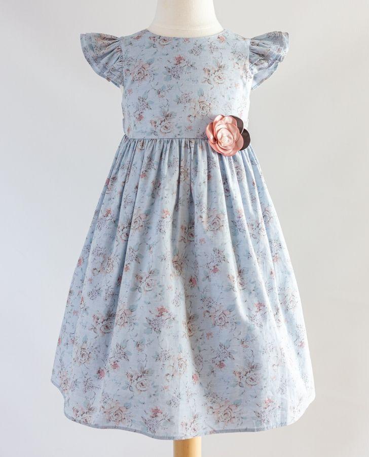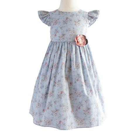 Girl's chambray allover floral print toddler dress with round neck, flutter sleeves, and a flower accent at the waist.