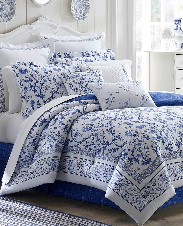 The beautiful Charlotte Euro sham is white faux linen with a 2" embroidered frame in blue threads.