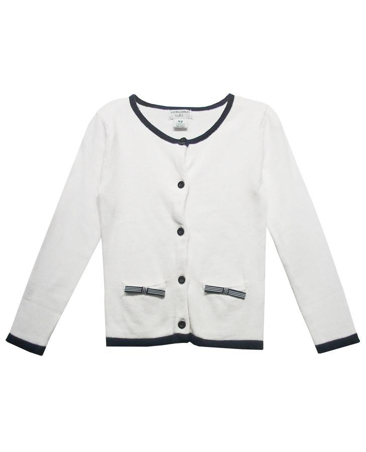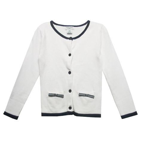 This pretty white crew neck cardigan features a contrast navy trim at the neckline, cuffs and hem, along with two bow front pockets.  Made from quality soft cotton, it's the perfect cardigan for everything from school days to special occasions.