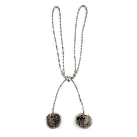 A fun and decorative curtain tieback featuring grey faux fur pom poms. Sold individually.