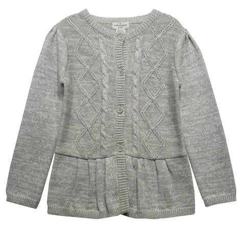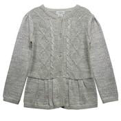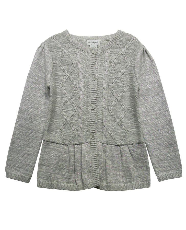 A cable knit diamond design, peplum silhouette and splash of silver shimmer makes this button front cardigan look great when paired with a pretty dress. Cardigan also adds a special touch when paired with leggings or jeans.