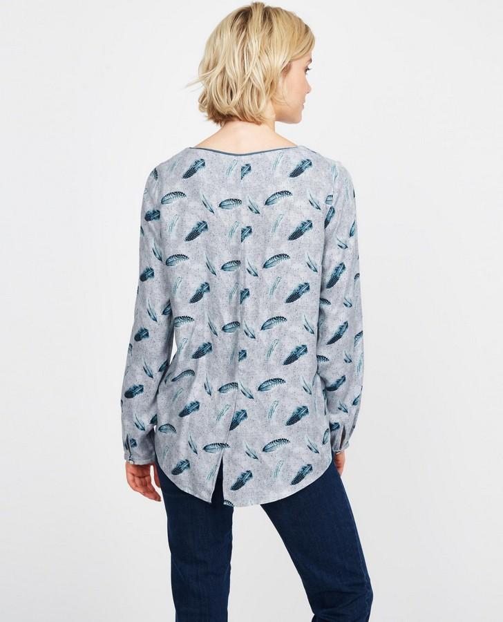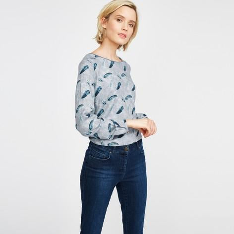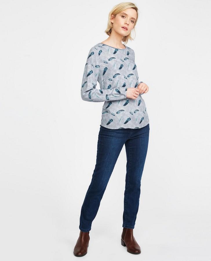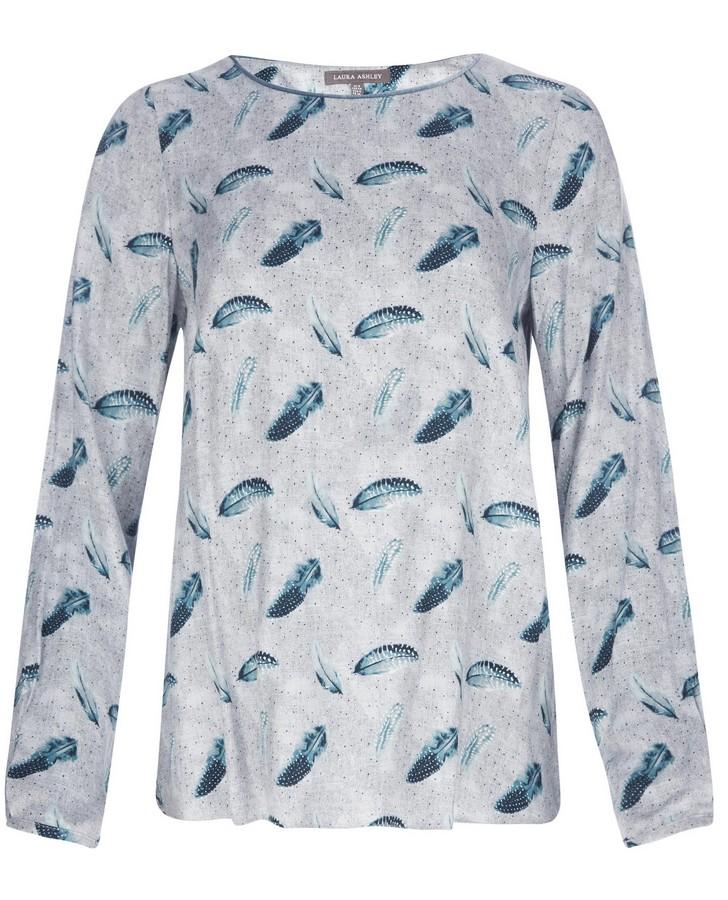 Tumbling feathers in blue are printed onto comfortable twill in our Dotty Feather Top. With a velvet trim at the neck, this piece is casual style with a touch of luxury.