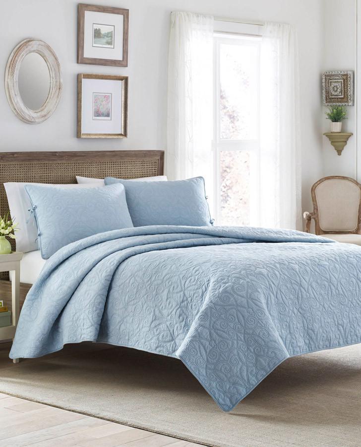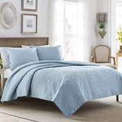 This Felicity blue quilt set is a great item to add to your current bedding or use on its own. The solid colour makes it easy to fit in your current decor or to use to layer onto your current bedding. 100% cotton materials are used, including the fill, for a soft to the touch feel. This quilt uses an ironwork quilt stitch design. Shams feature two ties for pillow inserts that are 6" apart and 10" long. Enjoy the comfort of this quilt set and sleep the night away.