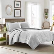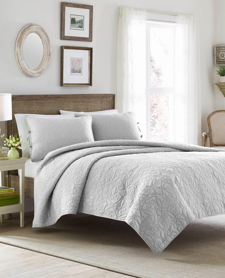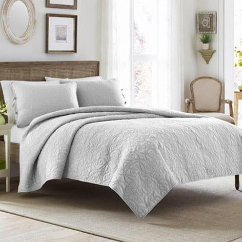 The Felicity Soft Grey quilt set is a great item to add to your current bedding or to use on its own. Quilt uses an ironwork quilt stitch design. Shams feature two ties for pillow insert that are 6" apart and 10" long. Enjoy the comfort of 100% cotton materials and sleep the night away with a new quilt. Set includes quilt and two shams (twin set includes one sham).