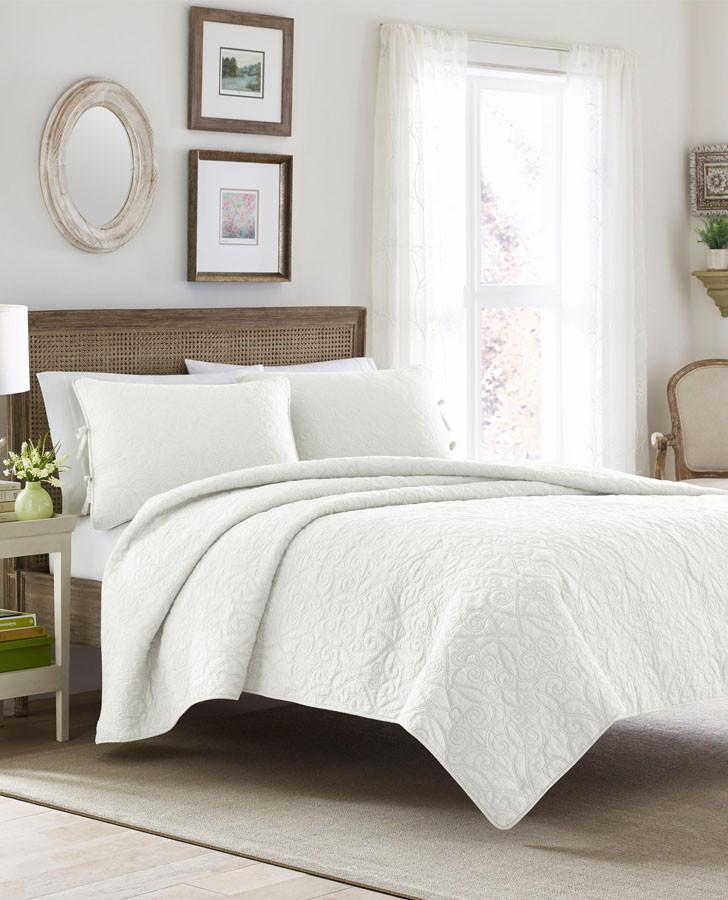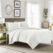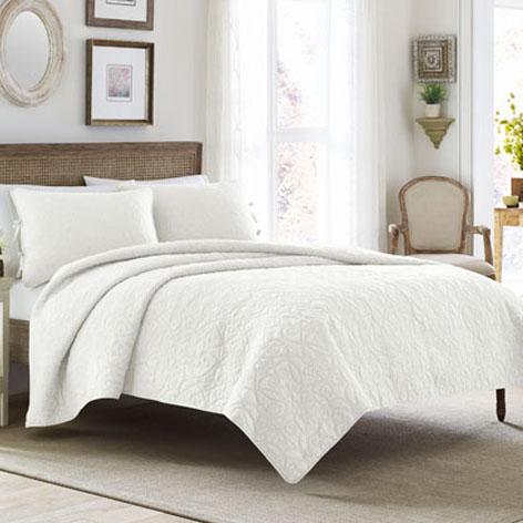 The Felicity White quilt set is a great item to add to your current bedding or to use on its own. The solid color makes it easy to fit in your current decor or to use to layer onto your current bedding. Quilt uses an ironwork quilt stitch design. Shams feature two ties for pillow insert that are 6" apart and 10" long. Set includes comforter and two shams (twin set includes one sham).