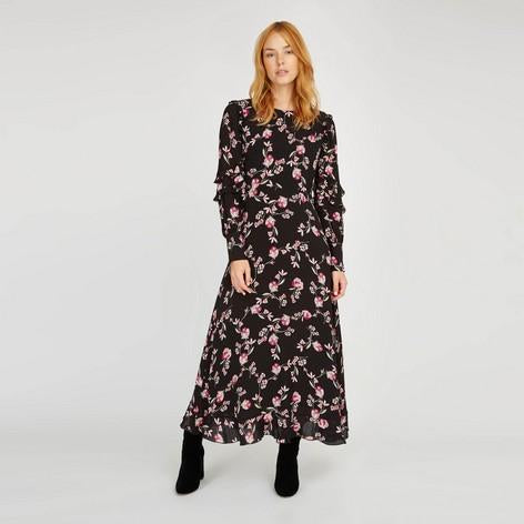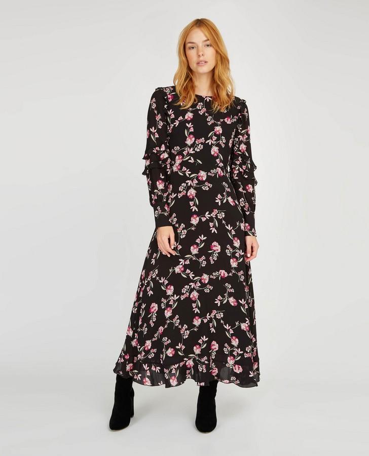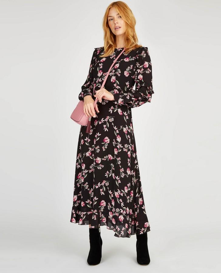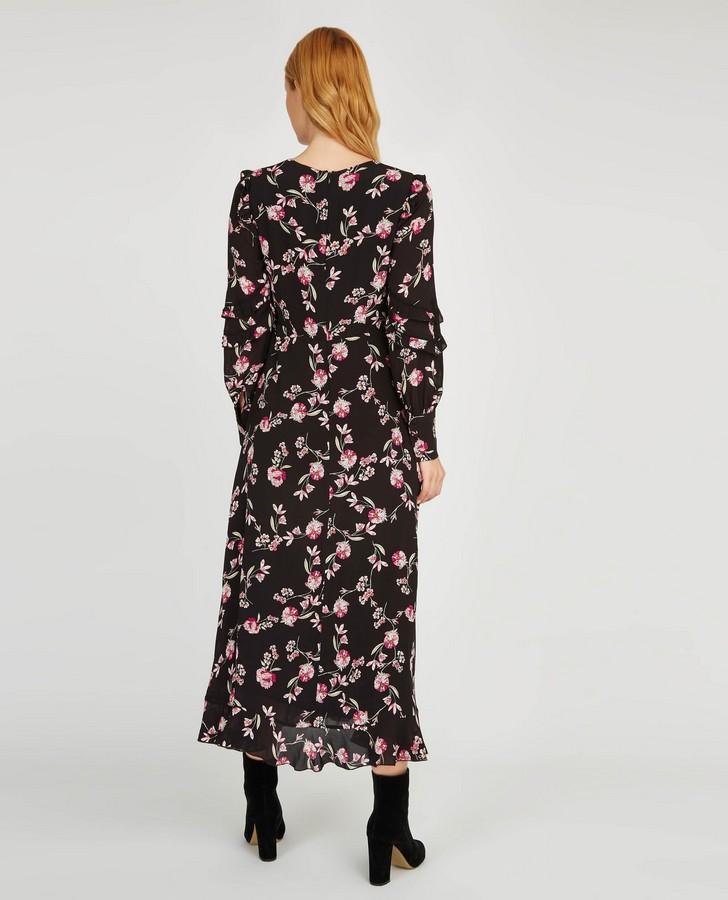 Pretty ruffle detailing gives this dress a feminine feel. Complemented by a floral print in pink and bold black, and finished with ruffled sleeves, this dress is stylish whilst still easy to wear.