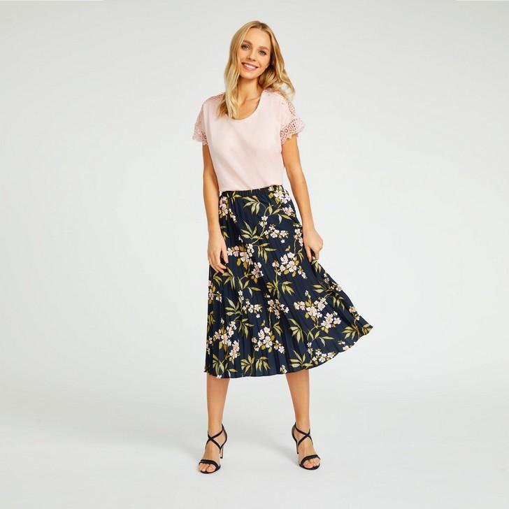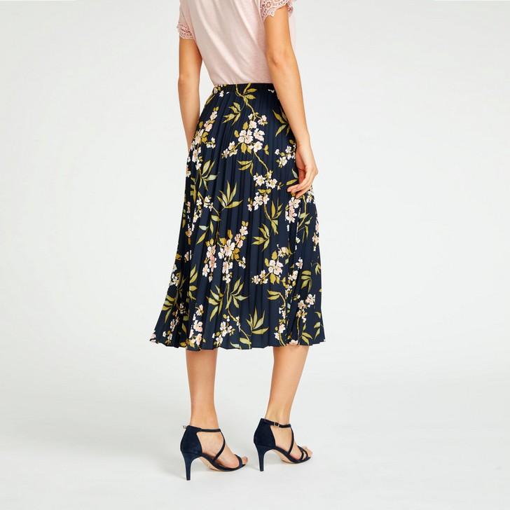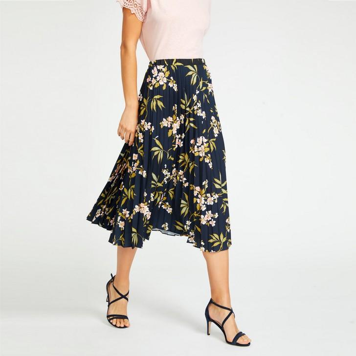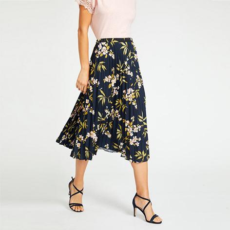 Delicately designed, our Calissa design is contemporary florals with a feminine finish. Featuring pink flowers on a sophisticated navy base, this skirt is beautifully structured with a accordion- pleat effect, and is effortlessly easy to style from casual into more formal looks.