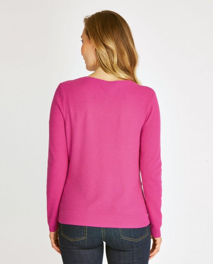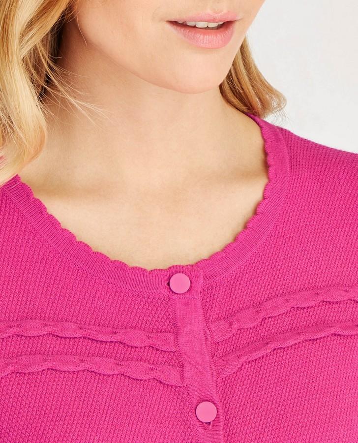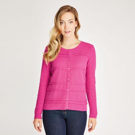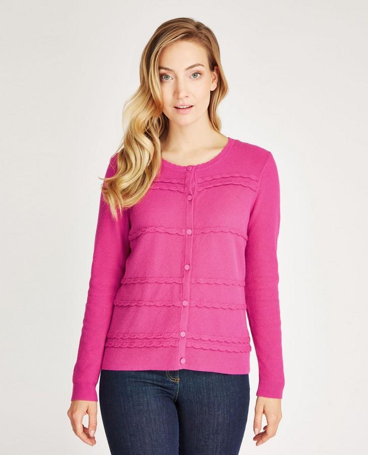 If you're looking to layer your looks and embrace the bold colour trends of the season, then everything you need is found in our Fuschia Rick Rack Cardigan. Playful rick rack scalloping decorates the front of this piece, and its made with a wool blend for the ultimate in cozy chic.