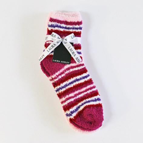 Two pair pack of cozy slipper socks in fuschia with pink stripes and solid pink.