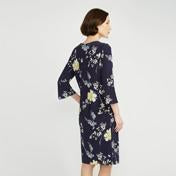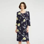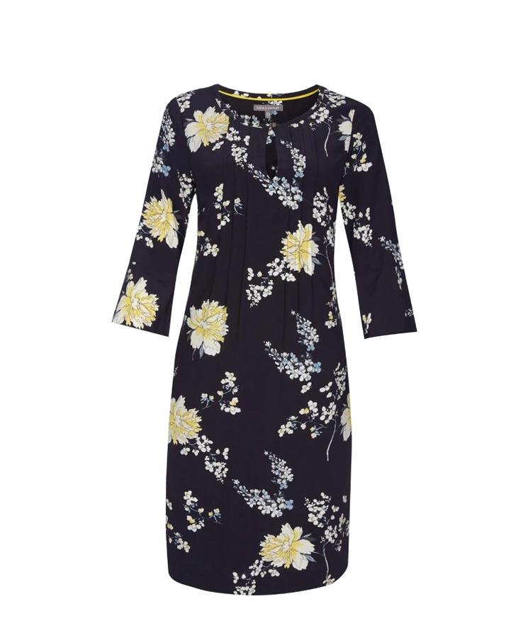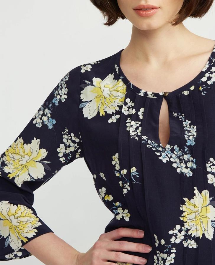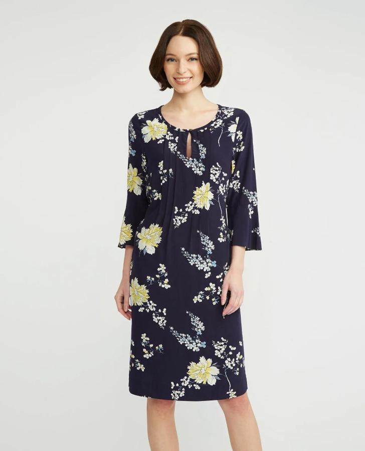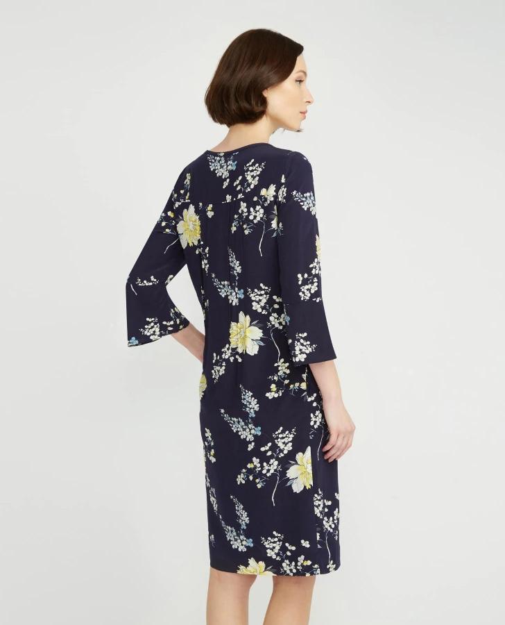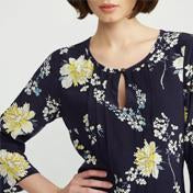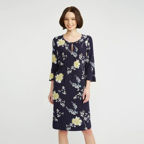 With beautiful pintuck work and a delicately patterned button accent in antique gold, our Garden Floral dress is comfortable style that doesn’t skimp on the details. Fluted sleeves give it a feminine touch, and a keyhole at the neck is a contemporary finish.