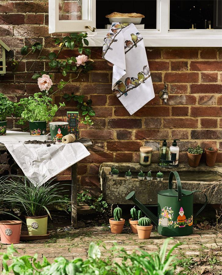 Our Gardeners print is bright and verdant, and features classic English garden paraphernalia. Wellies and wheelbarrows are surrounded by vibrant flowers while garden gnomes bring a touch of fun. When you water your flowers, do it in style with the Gardeners Watering Can providing some exterior inspiration.