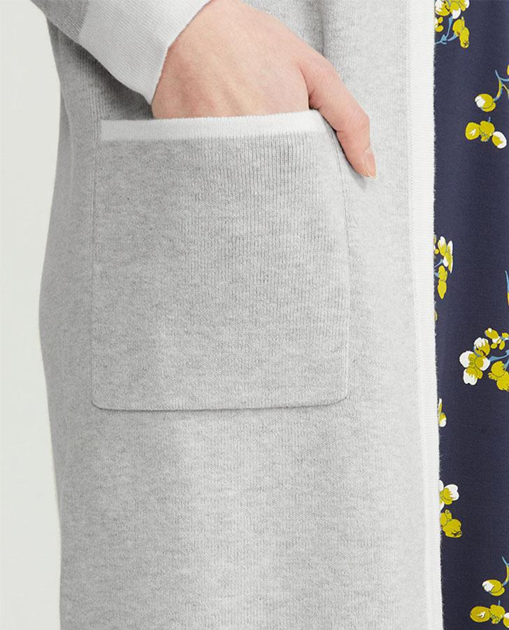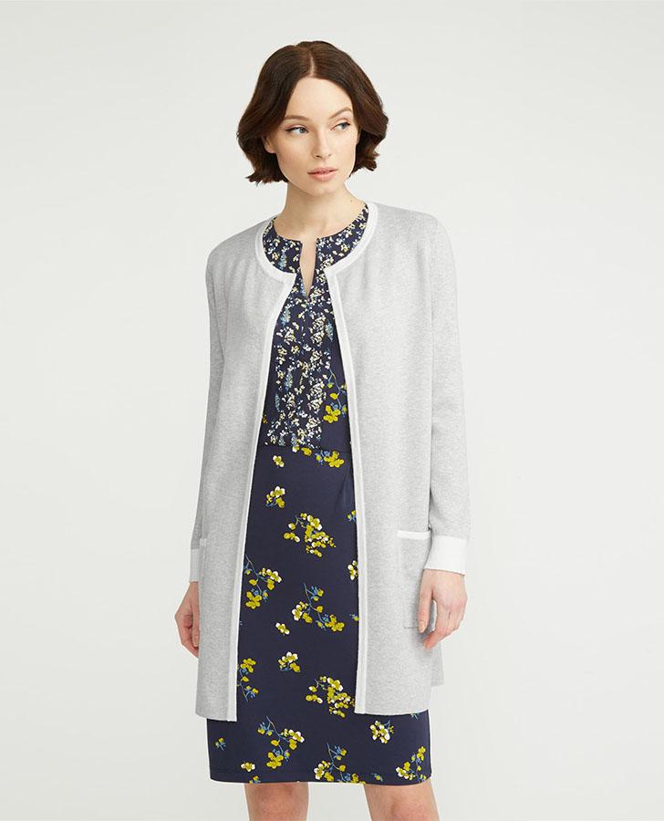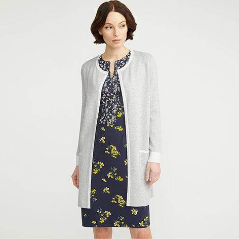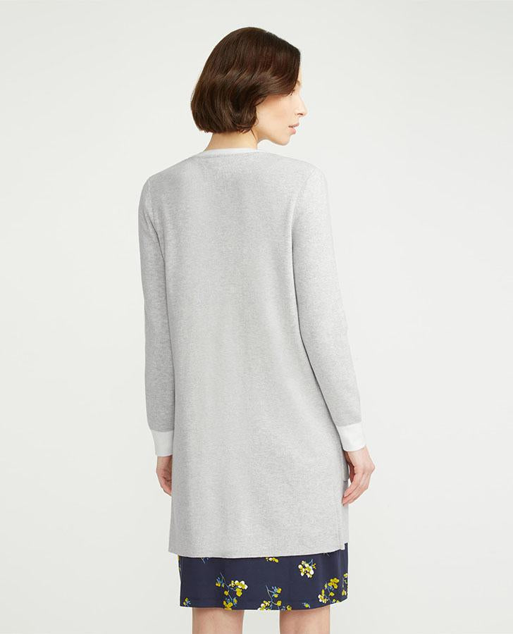 In soft grey with tipping in white, our Long Line cardigan is a comfy but chic way to layer your looks. Made from a cotton blend with a touch of wool for cozy warmth, this piece is easy to style and wonderfully comfy.