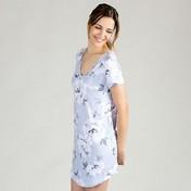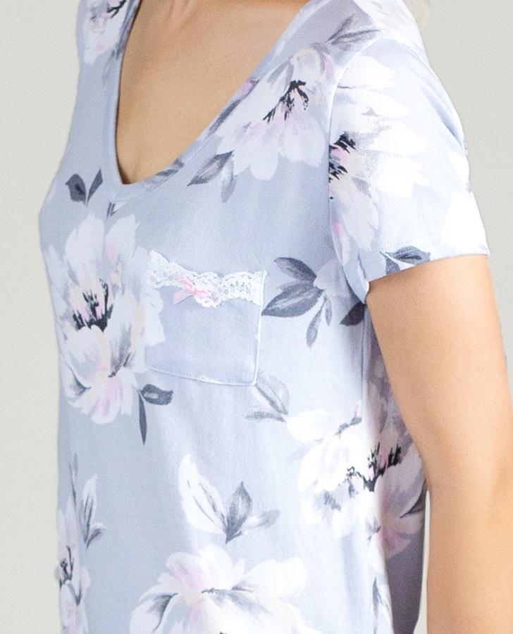 Women's Grey Painted Floral Print short sleeve v-neck sleepshirt with a white lace trimmed pocket.