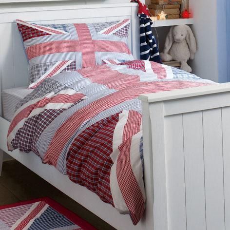 This cool and funky appliqued Union Jack design duvet set is made up of check and gingham prints in blue and red. Includes Euro twin duvet cover and one pillowcase.