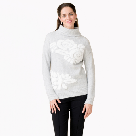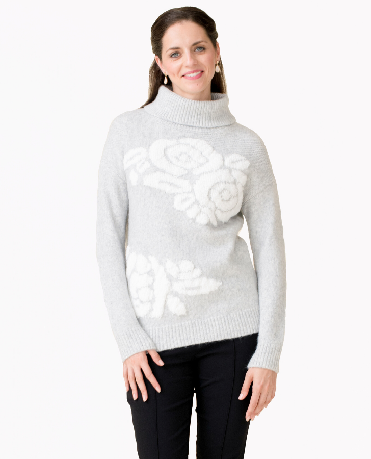 Heather grey cowl neck sweater with floral detail.