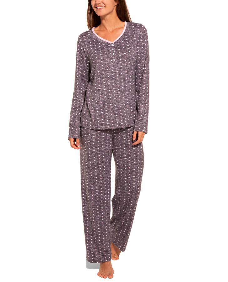 This long pant PJ set features a casual yet trendy heart print with a double banded collar and button detailing.