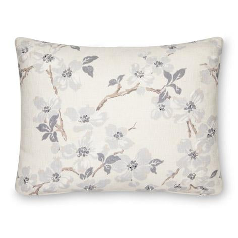 Our Iona cushion in cool slate grey is printed with pretty white blossoms on dark grey stems. Beadwork provides fine detailing amongst the flowers, and the whole piece looks beautiful on crisp, white bedlinens.