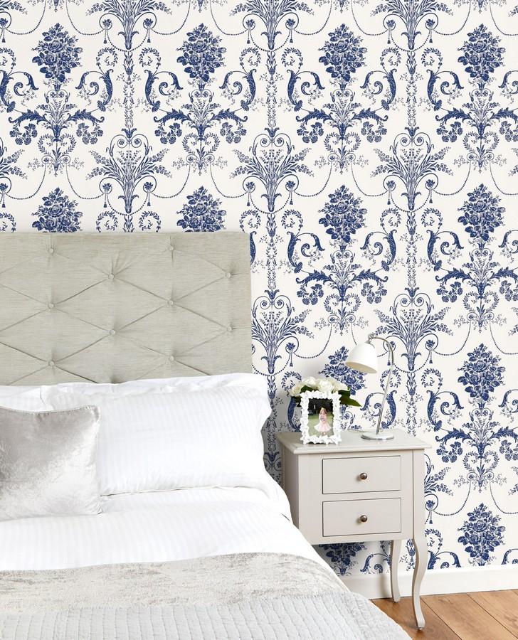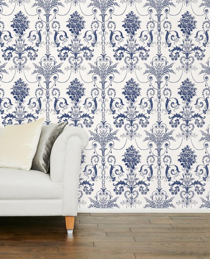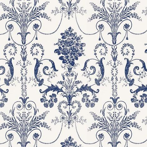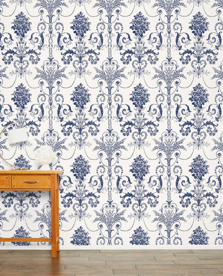 An undeniably elegant French-inspired damask design featuring a soft off white ground with a striking deep shade of midnight blue. Paste the Wall wallpaper is durable and extra washable and suitable for all rooms including kitchens and bathrooms. With no need to soak and no pasting table required, decorating has never been easier.