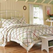Ruffle Garden is the newest addition to the Laura Ashley quilt assortment. Classic Laura Ashley prints are featured in an updated technique on the Ruffle Garden quilt. Bands of appliqued ruffles form a trellis pattern and are layered on top of an ivory ground with diamond quilting details. The accessories highlight the prints used on the quilt by using innovative techniques and textures.